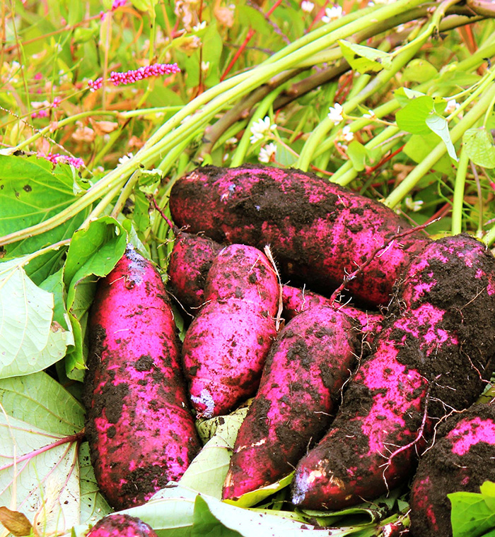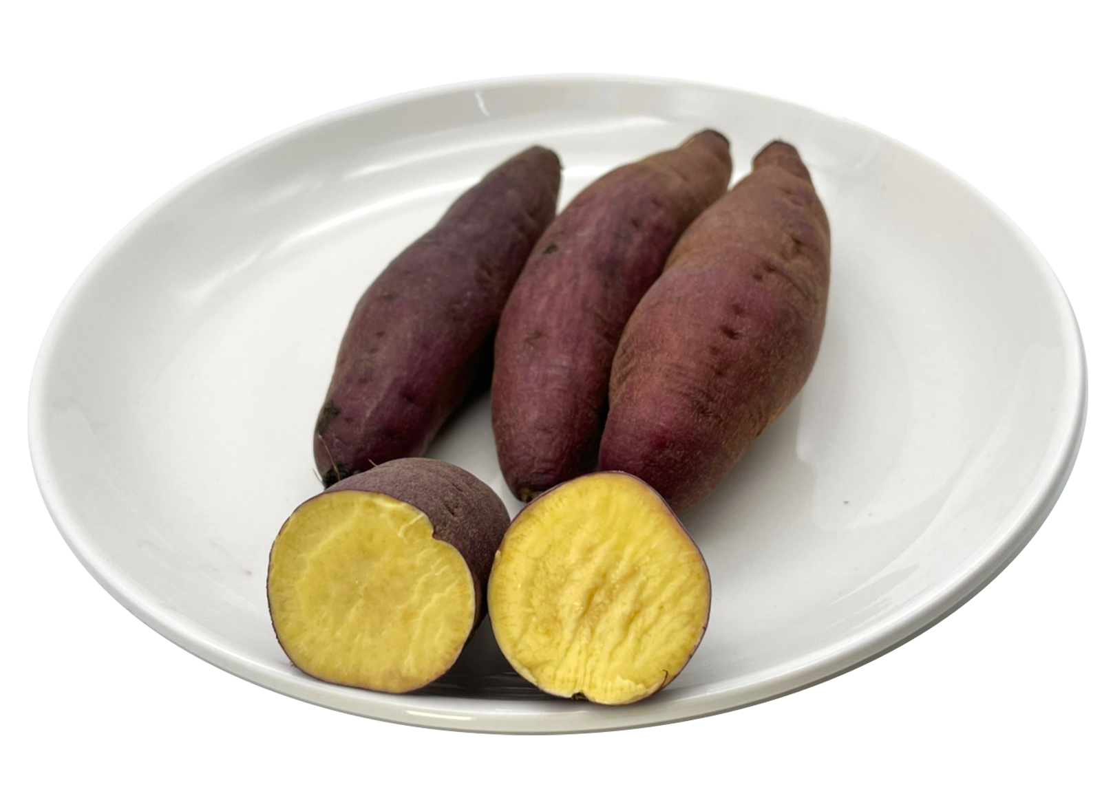 いもの形は長紡錘形で揃いが良く、ややゴツゴツしてどっしり感があります。 皮色はきれいな濃赤紫色で肉色は黄色く、焼き芋、てんぷら、大学いも、スイーツなど多くの用途に利用されています。